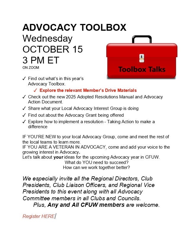 Let’s talk about your ideas for the upcoming Advocacy year in CFUW.